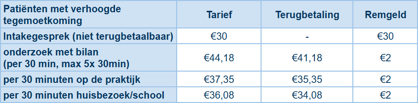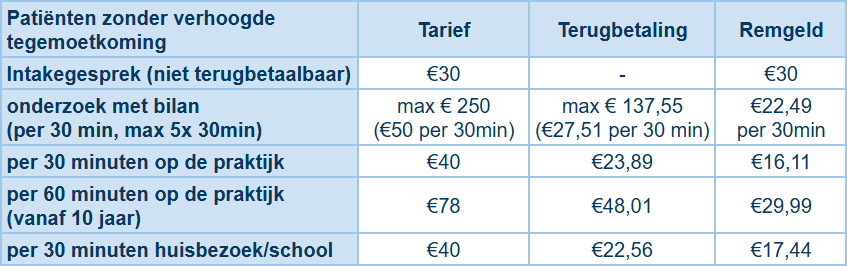 Ik ben gedeconventioneerd. Je kan mijn tarieven en terugbetalingen (RIZIV) terugvinden in onderstaande tabel. Wie recht heeft op een verhoogde tegemoetkoming, betaalt volgens de conventietarieven.